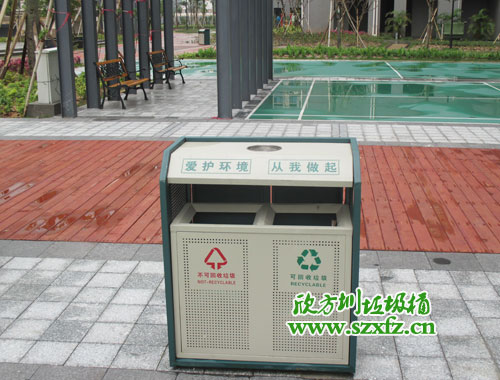 湖南衡陽農(nóng)林業(yè)采購人員找到欣方圳戶外垃圾桶廠家,采購的F69鋼板分類垃圾桶的規(guī)格為:770*400*920mm。鋼制垃圾桶頂部有煙灰桶,斜邊有愛護(hù)環(huán)境,從我做起。戶外垃圾桶中間有間隔,直接投遞垃圾進(jìn)入到兩個(gè)內(nèi)桶里面。戶外垃圾桶正面鋼板上有沖孔,左邊用紅顏色絲印不可回收垃圾及標(biāo)志,左邊用綠色絲印可回收垃圾字樣及標(biāo)志。整個(gè)鋼制垃圾桶,主要采用灰色與墨綠色兩種顏色為主。放在有草,有綠葉的地方,綠色環(huán)保味道特濃厚。