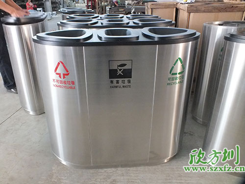 不銹鋼三孔分類環保回收箱使用范圍廣,表面光滑、亮麗,是電梯口、寫字樓、學校、物業、賓館、酒店、機場、汽車站等擺放的首選。