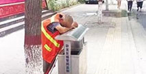 老環衛工趴在果皮箱休息 感動朋友圈