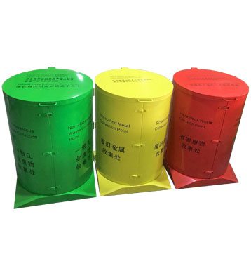 鋼制垃圾桶 采用優質冷軋鋼材料經剪鈑下料、折彎、沖壓、焊接、打磨、等工藝:表面經除油、防銹、酸洗磷化加工而成
