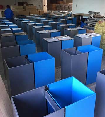欣方圳商場分類垃圾桶本身經噴砂處理去油去銹后,鋼板表面抗紫外線丙稀酸油漆多層噴涂。!