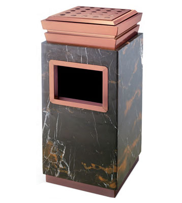 • 產品材質:采用天然的大理石與優質冷軋鋼板或不銹鋼鋼板制作而成,四面大理石用鋼板螺絲固定于桶體,有內桶,方便提倒垃圾,桶頭煙灰盅可放白石子可清洗,鋼板經折彎沖壓一次性成型。產品一律用室外粉靜電噴塑,經過180°的高溫,延長垃圾桶使用壽命,顏色持久不變亮麗如新。