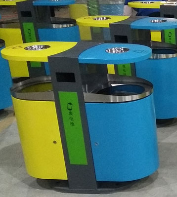 不銹鋼戶外果皮箱整體采用優(yōu)質(zhì)不銹鋼材質(zhì)制作,立柱做深灰、分類桶身做黃藍(lán)烤漆工藝多層防銹更耐用,投口為不銹鋼本色,巧妙利用立柱空間做廢舊電池分類收集。