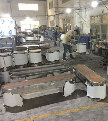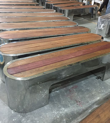 欣方圳不銹鋼長條橢圓休閑椅凳面防腐木材質制作流程示意圖,工藝領先,品質卓越,真正經久耐用。
