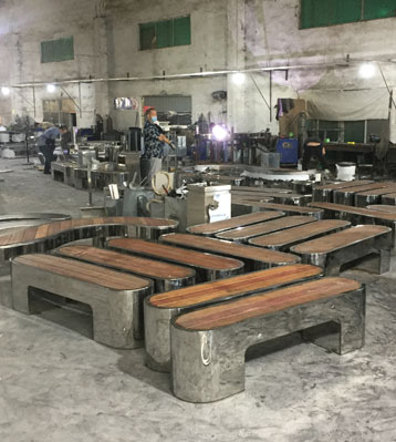欣方圳不銹鋼長條橢圓休閑椅椅面原材料采用真空泵排除空氣、填充防腐液、加壓滲透、抽真空排出多余防腐液達到先進的防腐防蟲工藝。