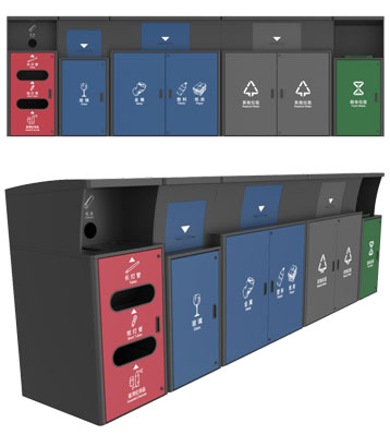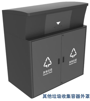 由有害垃圾、玻璃、金塑紙、廚余、其他垃圾收集容器組成.有害垃圾收集容器配外罩不配內桶,其余收集容器由外罩和120/240/660L內桶組成。