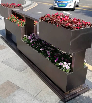 • 產品材質:不銹鋼道路花箱可采用5mm加厚201#/202#/304#不銹鋼材料模壓或焊接成型,金屬亮澤,內外表面光潔,易于清潔,表面可做電鍍壓紋、水鍍、蝕刻、納米鎳、無氰堿性光亮鍍銅工藝效果,無指紋處理高檔大氣;