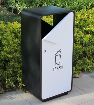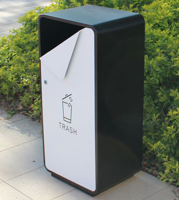 桶頭R角弧度防撞設計,投口折紙創(chuàng)意設計,使這款戶外果皮箱在城市擺放新穎時尚,黑白色調(diào)方形外觀可雙向果皮垃圾投放,不銹鋼烤漆戶外防銹升級耐用!